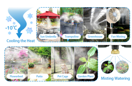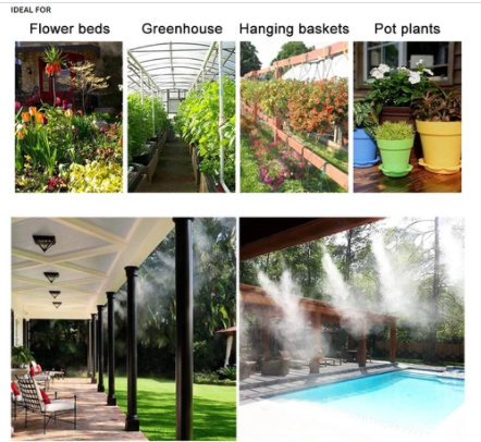 The Mist Cooling Automatic irrigation System is a great tool for atomization, lawn irrigation, patios, gardens, vegetable irrigation, roof cooling, agriculture, vegetable , greenhouse, flower bed, fog cooling irrigation etc. Also with it, you can cover a more large area than traditional watering, increasing humidity effectively and reducing dust particles.